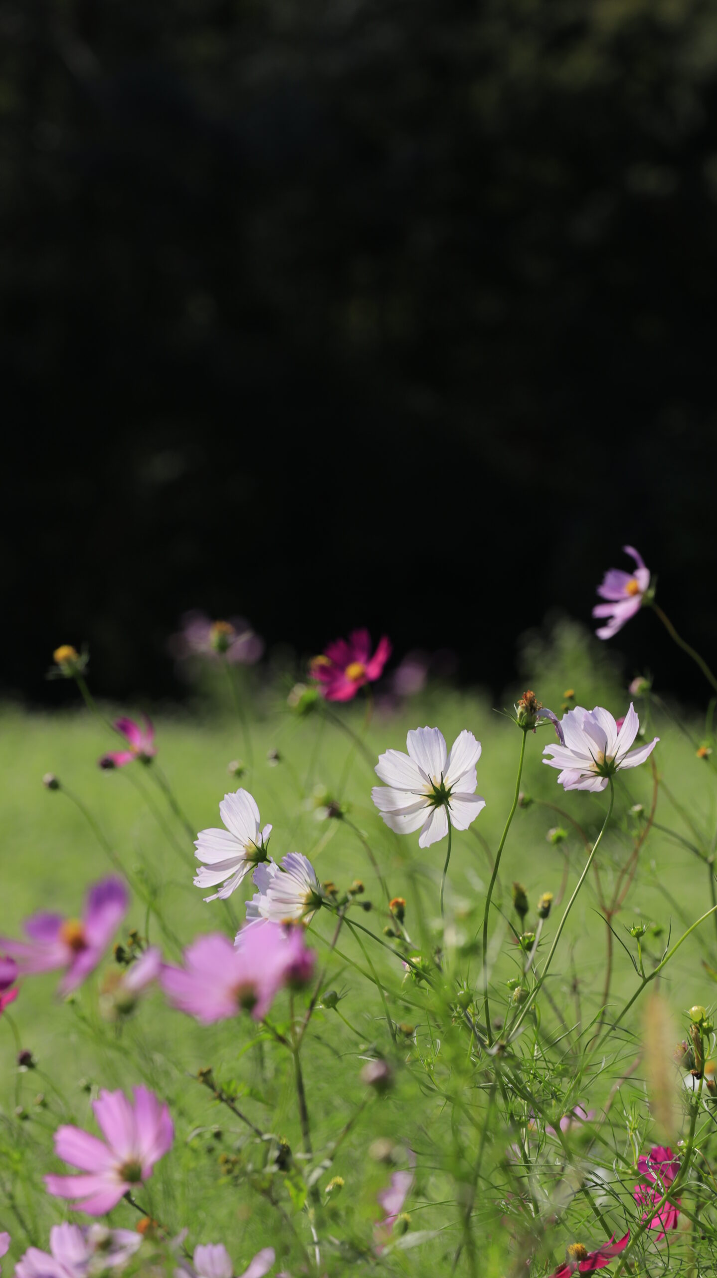 この写真は、真岡鉄道の多田羅駅付近で、ピンクや白のコスモスを背後から透かす光で表現し、花びらの美しい質感を引き出したものです。