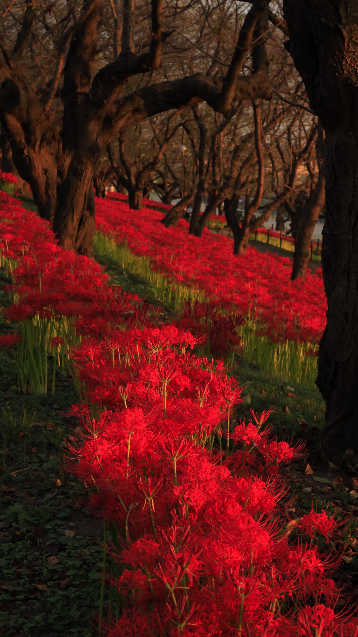 この写真は、幸手権現堂で、木々の下に広がる無数の彼岸花が夕日に照らされ、赤く染まる様子を撮影したものです。自然の陰影が美しい立体感を生んでいます。