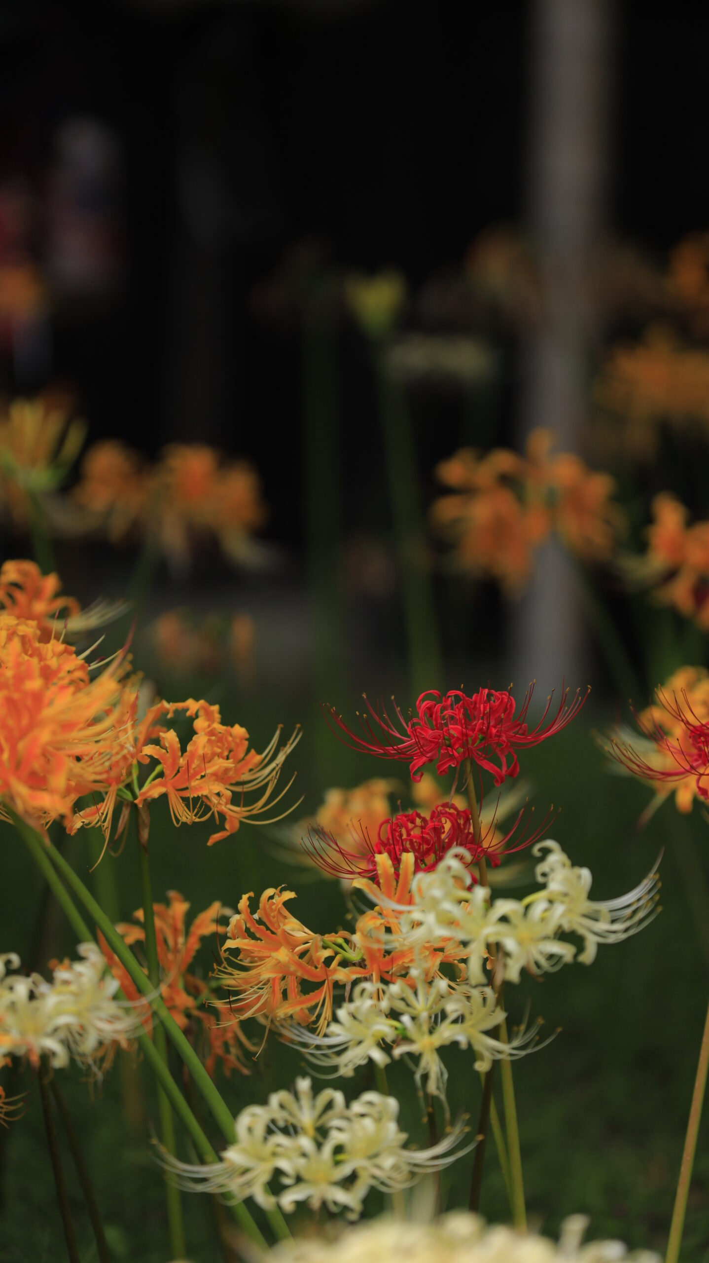 この写真は、西方寺(横浜)で、赤・白・橙色の彼岸花が咲き乱れる様子を撮影したものです。色とりどりの花々が秋の訪れを鮮やかに告げています。