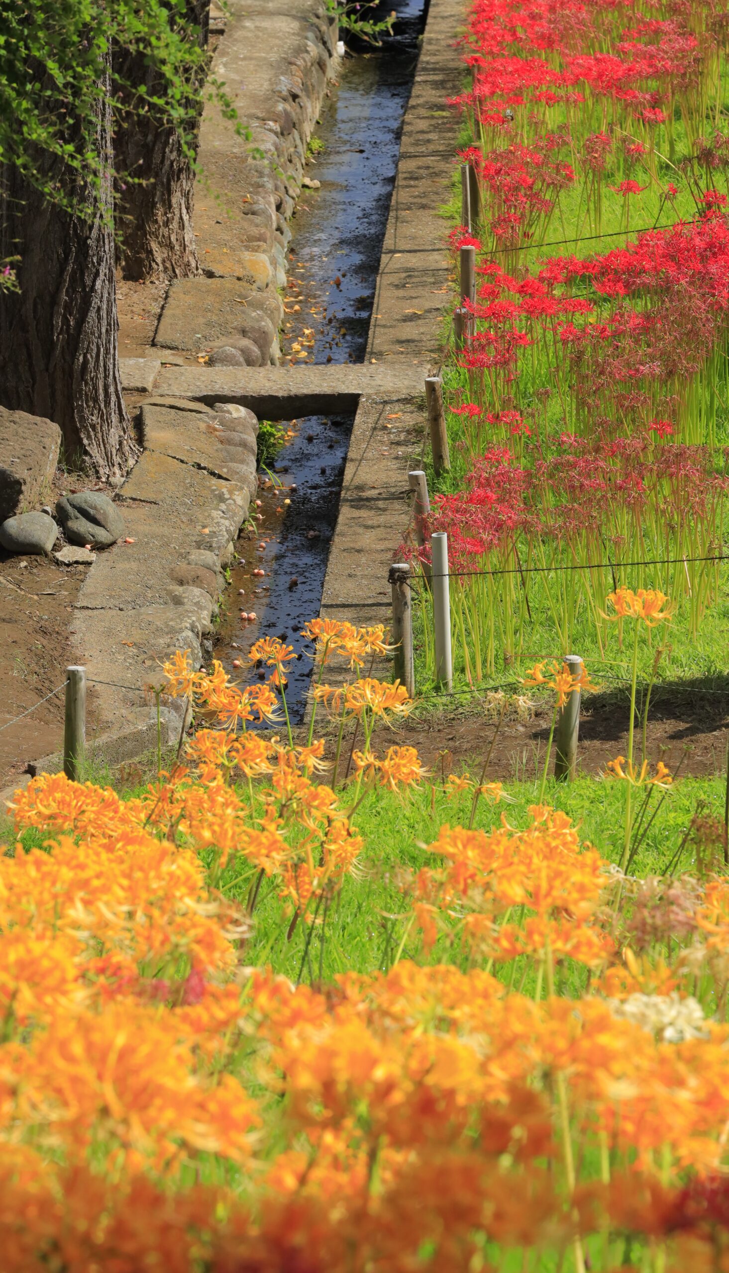 この写真は、西方寺(横浜)で、階段の上からオレンジと赤の彼岸花を見下ろすように撮影したものです。高低差のある構図で奥行きを強調しました。