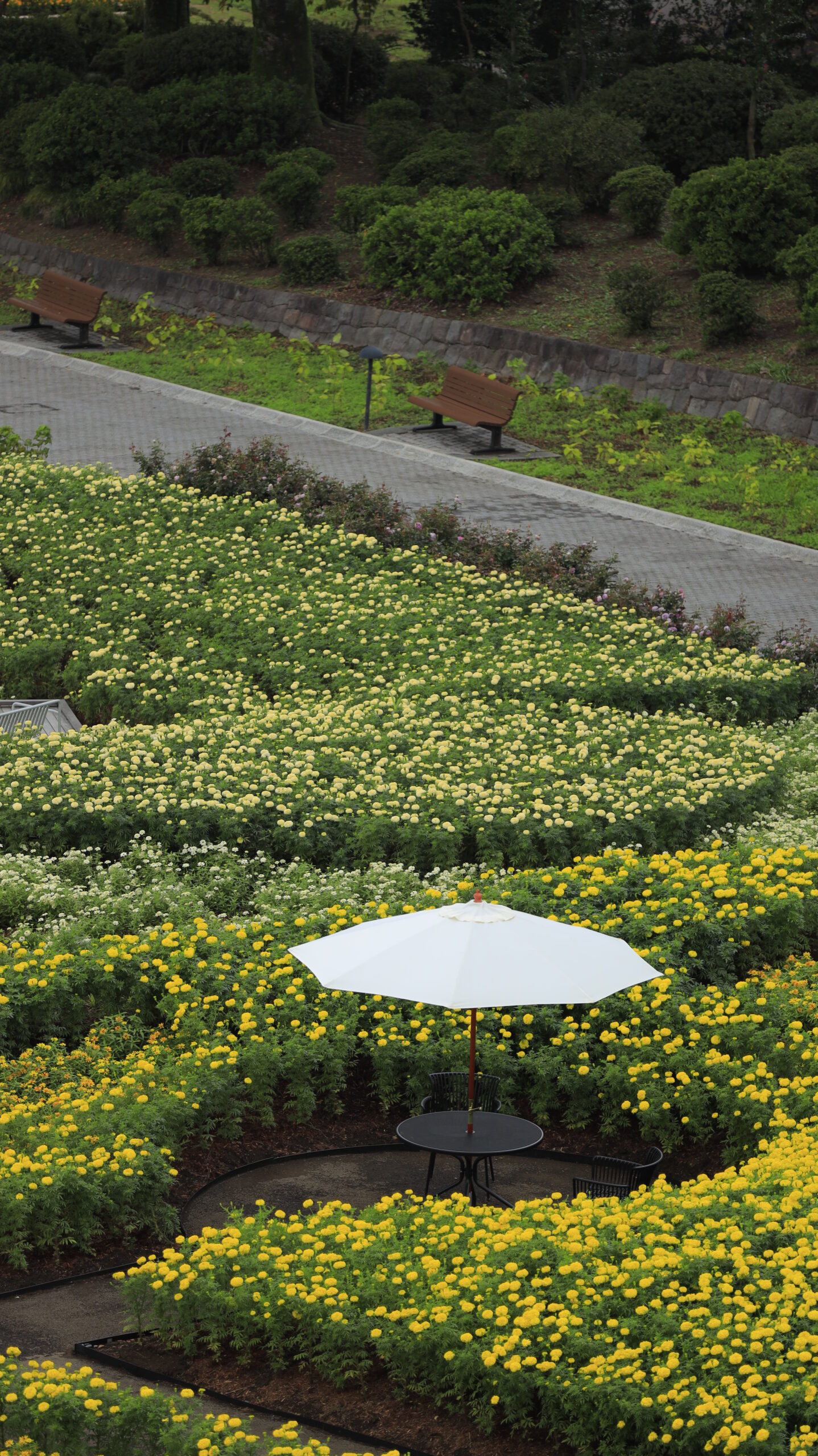 この写真は、ぐんまフラワーパークで、展望台の上から見下ろす形でマリーゴールド畑と休憩スポットを撮影したものです。高い位置からの眺めが公園全体の広がりを強調し、花の波が一面に広がる様子を映し出しています。
